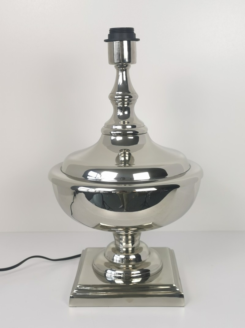Podstawa lampy ma solidną konstrukcję, co zapewnia stabilność, a jej stylowy kształt nawiązuje do klasycznych form dekoracyjnych, co sprawia, że będzie doskonałym uzupełnieniem każdego salonu, sypialni czy biura. Niklowane wykończenie dodaje jej elegancji i sprawia, że doskonale odbija światło, wprowadzając do wnętrza dodatkowy blask.