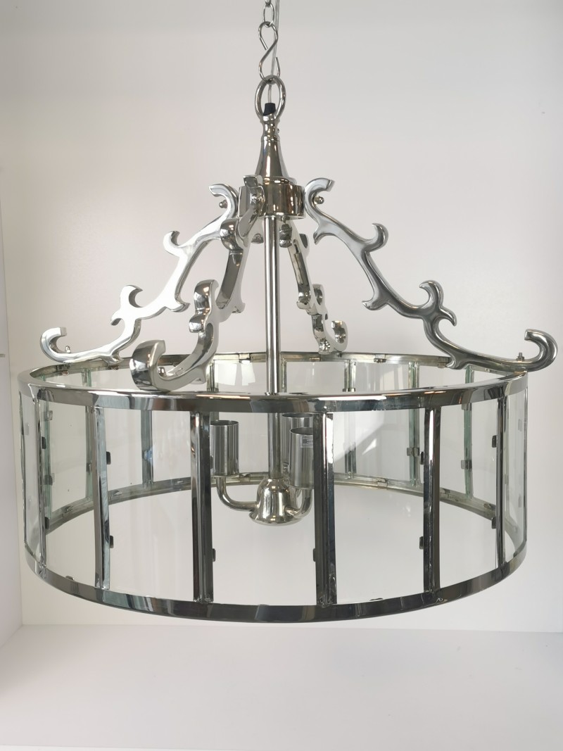 Elegancka lampa wisząca o niepowtarzalnym designie, który przyciąga wzrok swoim nowoczesnym, a jednocześnie klasycznym charakterem. Lampa składa się z metalowej ramy w chromowanym wykończeniu, ozdobionej dekoracyjnymi, falistymi elementami na górze, co nadaje jej oryginalności i stylu. Klosz w formie szerokiego pierścienia jest wykonany z przezroczystego szkła, które nie tylko pięknie rozprasza światło, ale także eksponuje wnętrze lampy. Zawieszona na długim łańcuchu, pozwala na regulację wysokości, co sprawia, że idealnie wpasuje się w różne przestrzenie, od nowoczesnych salonów po eleganckie jadalnie.