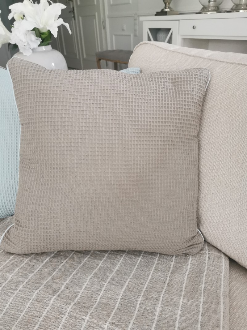 Elegancka poduszka bawełniana w kolorze beżowym z delikatną błękitną lamówką to stylowy dodatek, który wniesie do wnętrza przytulność i subtelną elegancję. Wykonana z wysokiej jakości bawełny, jest miękka w dotyku, a dzięki syntetycznemu wypełnieniu zachowuje swój kształt i zapewnia komfort codziennego użytkowania. Poduszka świetnie sprawdzi się w salonie, sypialni czy pokoju dziennym, jako ozdoba sofy, fotela lub łóżka. Można ją skompletować z poduszką o odwrotnej kolorystyce – błękitną z beżową lamówką – tworząc spójny i elegancki zestaw dekoracyjny. To idealna propozycja dla osób ceniących minimalizm, naturalne materiały i subtelne kontrasty w aranżacji wnętrz.