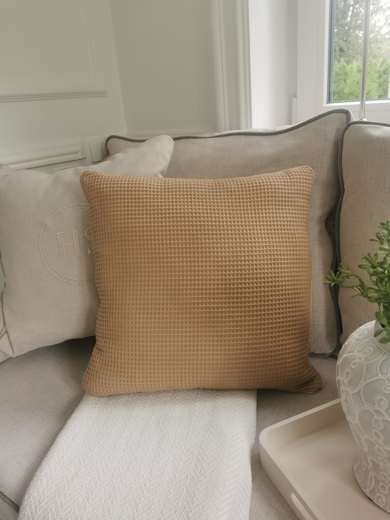 Nadaj swojemu wnętrzu wyjątkowego charakteru dzięki eleganckiej poduszce dekoracyjnej w kolorze ciepłego brązu, wykonanej z przyjemnej tkaniny bawełnianej o strukturze wafla. Jej prosta forma i subtelna faktura sprawiają, że doskonale komponuje się z różnymi aranżacjami – od nowoczesnych, przez skandynawskie, aż po klasyczne. To nie tylko estetyczny dodatek, ale także praktyczny element, który podnosi komfort codziennego odpoczynku.