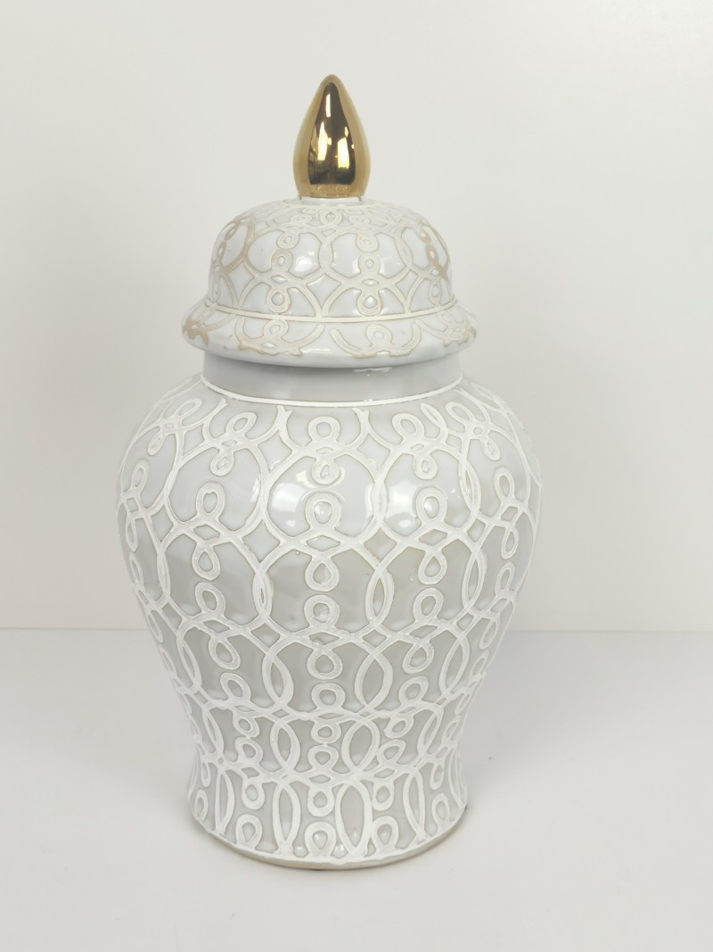 Wprowadź do swojego wnętrza subtelny luksus dzięki biało-perłowej wazie ceramicznej z efektownym reliefowym wzorem oraz złotym wykończeniem na pokrywie. Jej klasyczny, a zarazem nowoczesny design doskonale sprawdzi się w stylach glamour, Hampton, nowoczesnym i klasycznym, dodając wnętrzom ponadczasowego charakteru. Dzięki ręcznie wykonanej strukturze reliefowej, wazon wyróżnia się unikalnym wyglądem i efektowną fakturą, która pięknie odbija światło. Może służyć zarówno jako samodzielna ozdoba, jak i wazon na kwiaty, tworząc wyjątkowy akcent dekoracyjny w salonie, jadalni, sypialni lub gabinecie.
